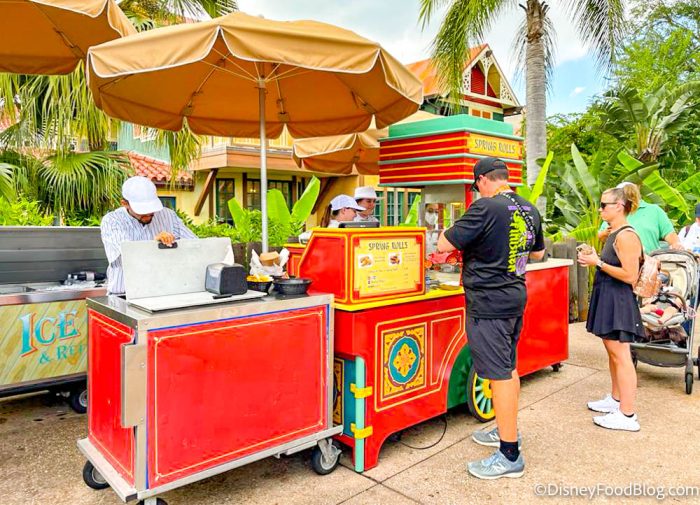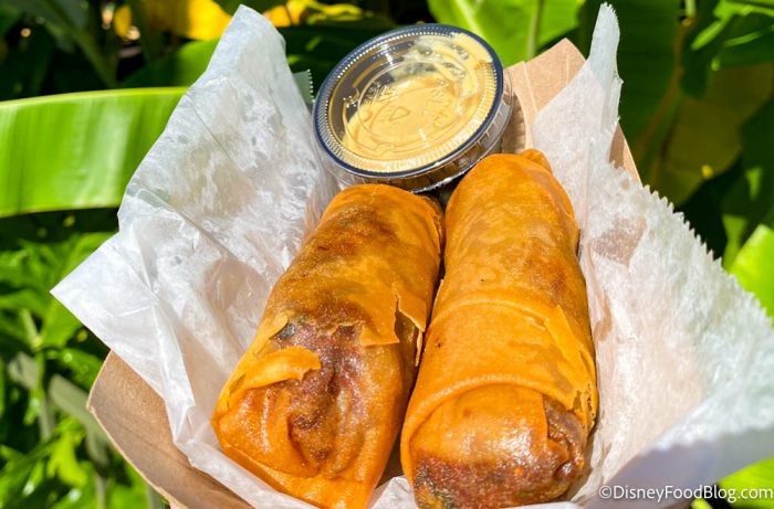 Okay, let’s talk about some tried and true favorites that keep us coming back to Magic Kingdom, since that’s the only place we can find these favorite snacks! Spring Rolls may not be your first thought when you think of theme park food, but they will be once you try these! The Spring Roll Wagon is located near the entrance to Adventureland, and these spring rolls really are worth all the hype they’ve been getting.