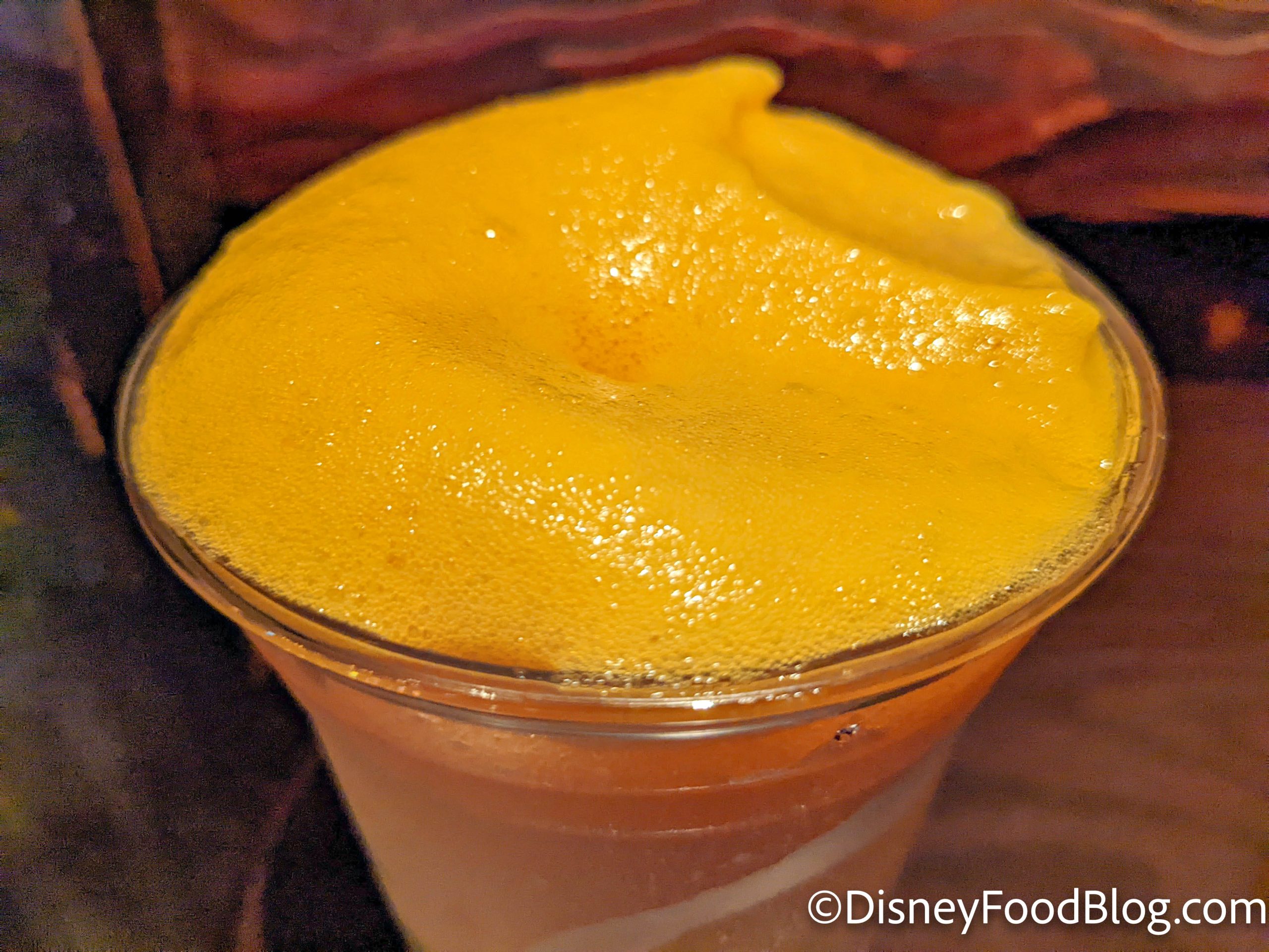 This drink is a no-sugar added frozen apple juice that is flavored with marshmallows for sweetness and then topped with creamy passionfruit foam. Even though it looks like ale, this is a non-alcoholic drink, so this one can be enjoyed by your entire group, including the kiddos. And the foam on the top really does help make the drink look more ale-like. In fact, the kids will REALLY love this one, because the marshmallow makes it very sweet.