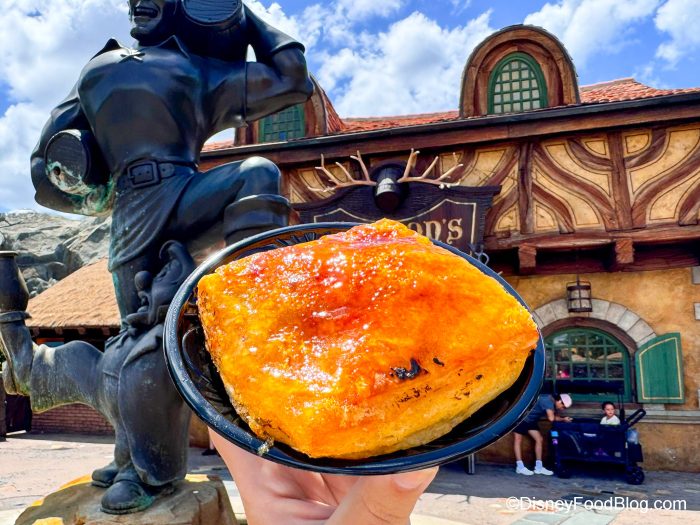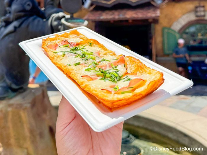 We only had one word come to mind after trying it for the first time: “spectacular.” Truly — the crust on this snack is soft, buttery, and flaky. The savory ham pieces were salty and added the perfect chew. The melted gruyère on top added a creamy, cheesiness that’s almost fondue-like. To top it all off, the green onions add a touch of tanginess that’s unmatched making this one a must-have on our visits to the park.