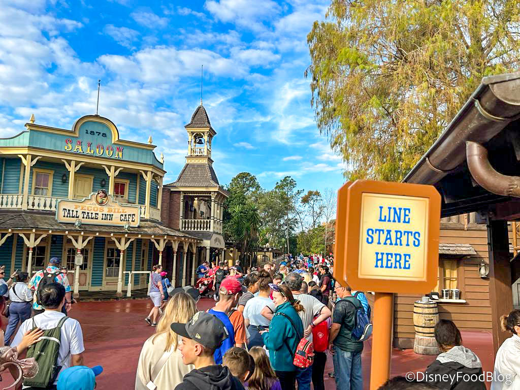 The “line starts here” sign for the ride is almost at the edge of Frontierland.