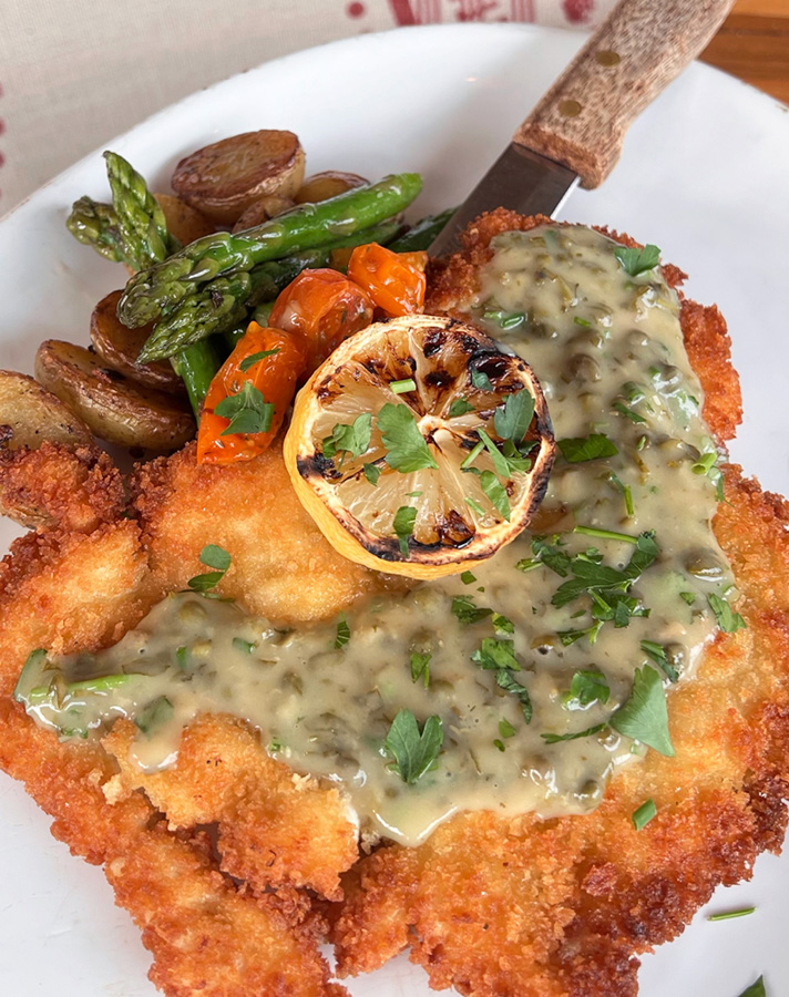 - ADDED: Skillet-fried Chicken Paillard — Art’s spin on piccata. Buttermilk-brined chicken is pounded thin, hand-breaded and skillet-fried, then topped with lemon butter, garlic and capers. Served with roasted potatoes and grilled asparagus for $28