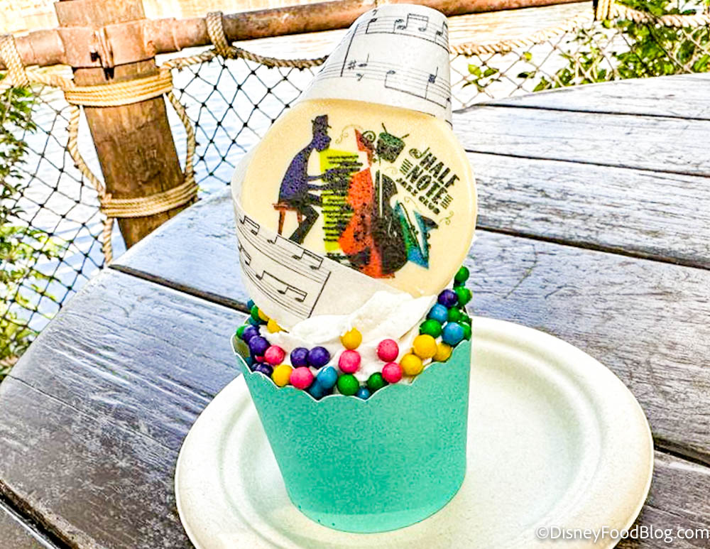 We also found this fancy Soul Cupcake for the celebration! It is a vanilla cake with bananas foster filling, vanilla marshmallow buttercream, a Joe Gardner (from Pixar’s Soul) white chocolate medallion, and edible paper music notes with multi-colored crispy pearls.