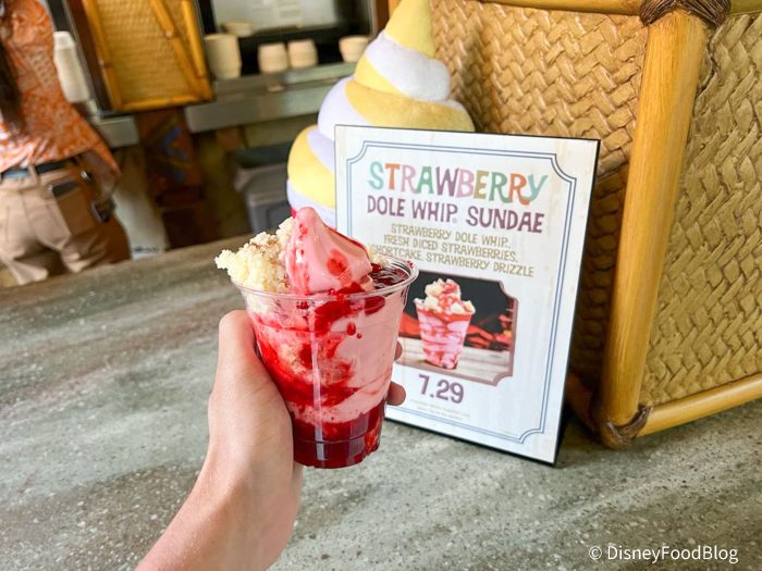 The Tropical Hideaway offers both classic DOLE Whip items as well as some more unique takes, like the new Strawberry Dole Whip Sundae. Strawberry DOLE Whip is blended with fresh diced strawberries and topped with pieces of shortcake and strawberry drizzle in a treat that certainly makes us forget all about that winter weather.