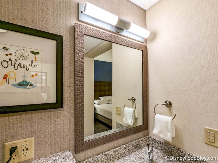 The mirror has a lighted frame, and there’s a main overhead light in this bathroom as well.