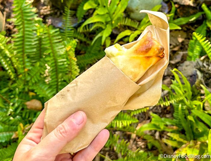 While we’re talking about walkability, we thought this was the perfect snack to keep you eating and trekking through your day. Cast members will wrap it in a thin paper wrapping so it was a great “on the go” snack option. The other side of that is that this was a snack that wouldn’t travel too well. This snack seems to be meant to eat in one sitting and while it’s not impossible to wrap it back up and take it with you in a bag, you may not want to do that because of the gooey filling. Additionally, guests that have allergies to cream cheese or pineapple will want to avoid this snack and opt for something different.