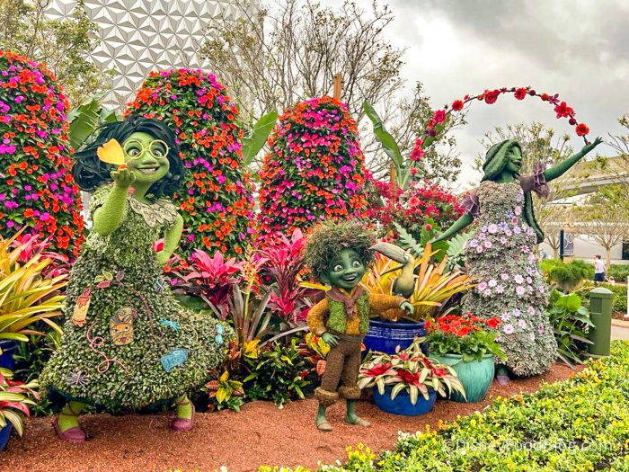 For 2023, a new Princess Tiana topiary appears in The American Adventure pavilion, and a NEW “Encanto” topiaries features Mirabel, Antonio, Isabela, and Luisa near the park’s main entrance.