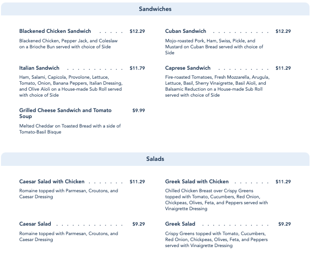 - Want a simple meal that’s slightly better your average theme park food. The food here isn’t really anything super exciting, but that Blackened Chicken Sandwich was pretty good, and you can also find pretty healthy options on the menu, like salads.