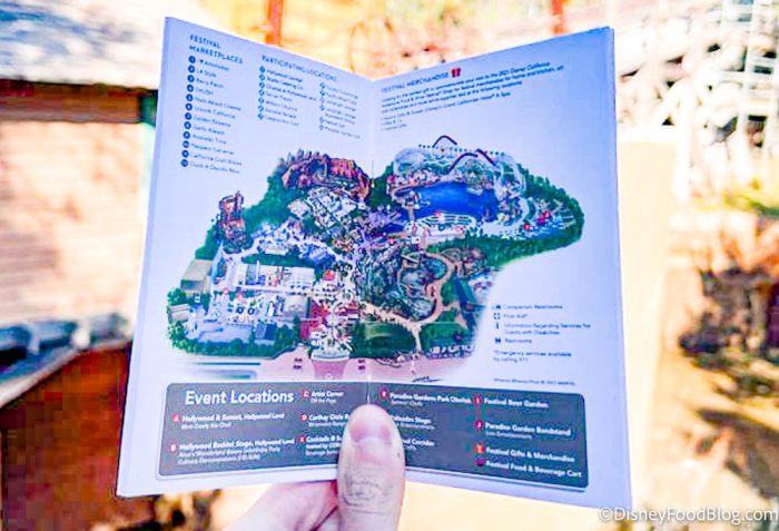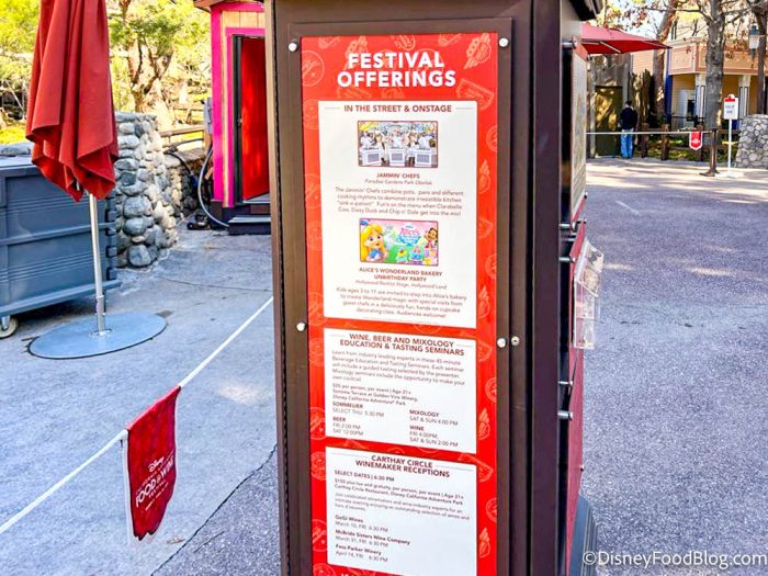 We were visiting California Adventure when we noticed that some of the festival booths were already open! There are signs around the park with the festival offerings…