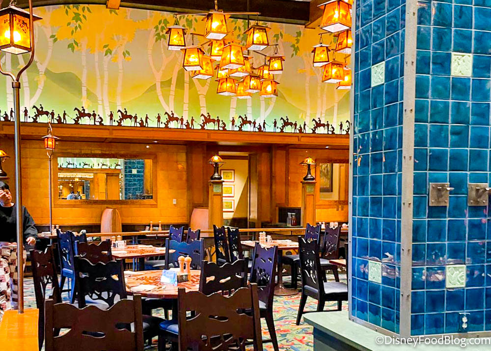 Storytellers Cafe, in Disneyland Resort’s Grand Californian Hotel & Spa, is a buffet-style restaurant that celebrates the art of storytelling through large paintings and murals, silhouettes, and stained glass design elements throughout the space.