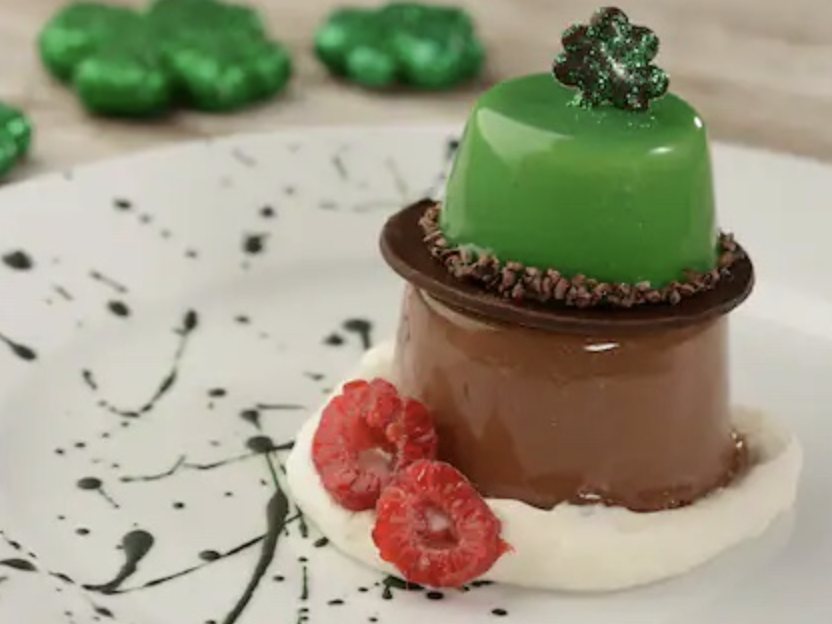 - Mickey Pot of Gold: Stout-chocolate cake filled with Irish cream mousse dipped in chocolate shell, buttercream, gold sprinkles, and rainbow gummy (New)