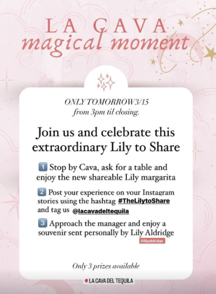 Today ONLY (March 15th) from 3PM until closing, you’ll want to stop by La Cava del Tequila and order the shareable Lily margarita (remember it’s for table service only). Then, you can post about your experience via Instagram using certain hashtags and tags. Finally, approach the manager of the restaurant, and then you’ll be able to enjoy a “souvenir sent personally by Lily Aldridge!”