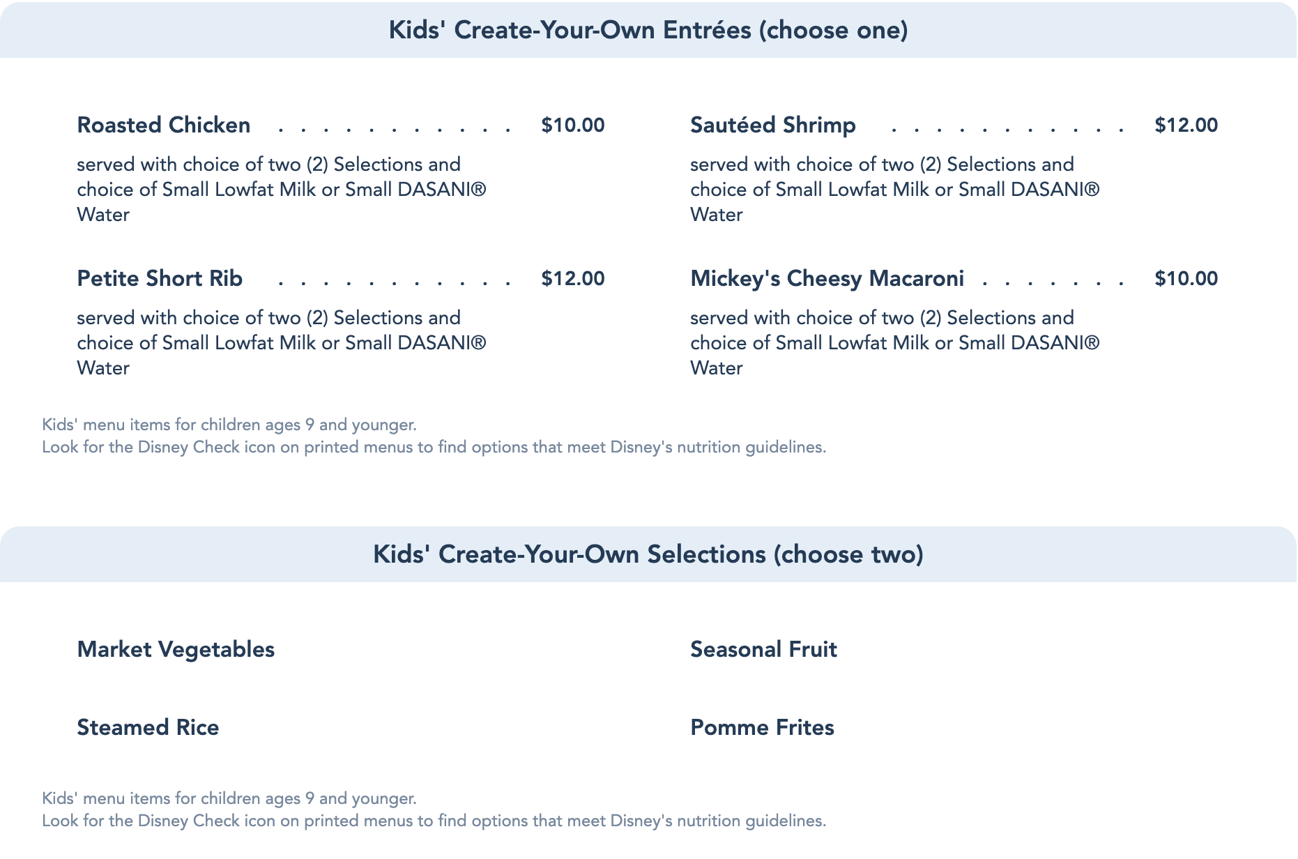 They have multiple options for the kiddos as well! For children 9 and under, you can order the Roasted Chicken, Petite Short Rib, Sauteed Shrimp, or Mickey’s Cheesy Macaroni.