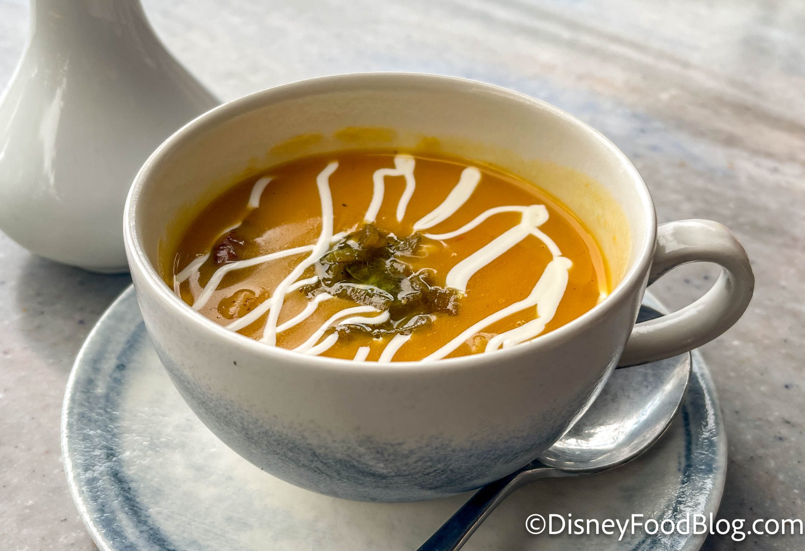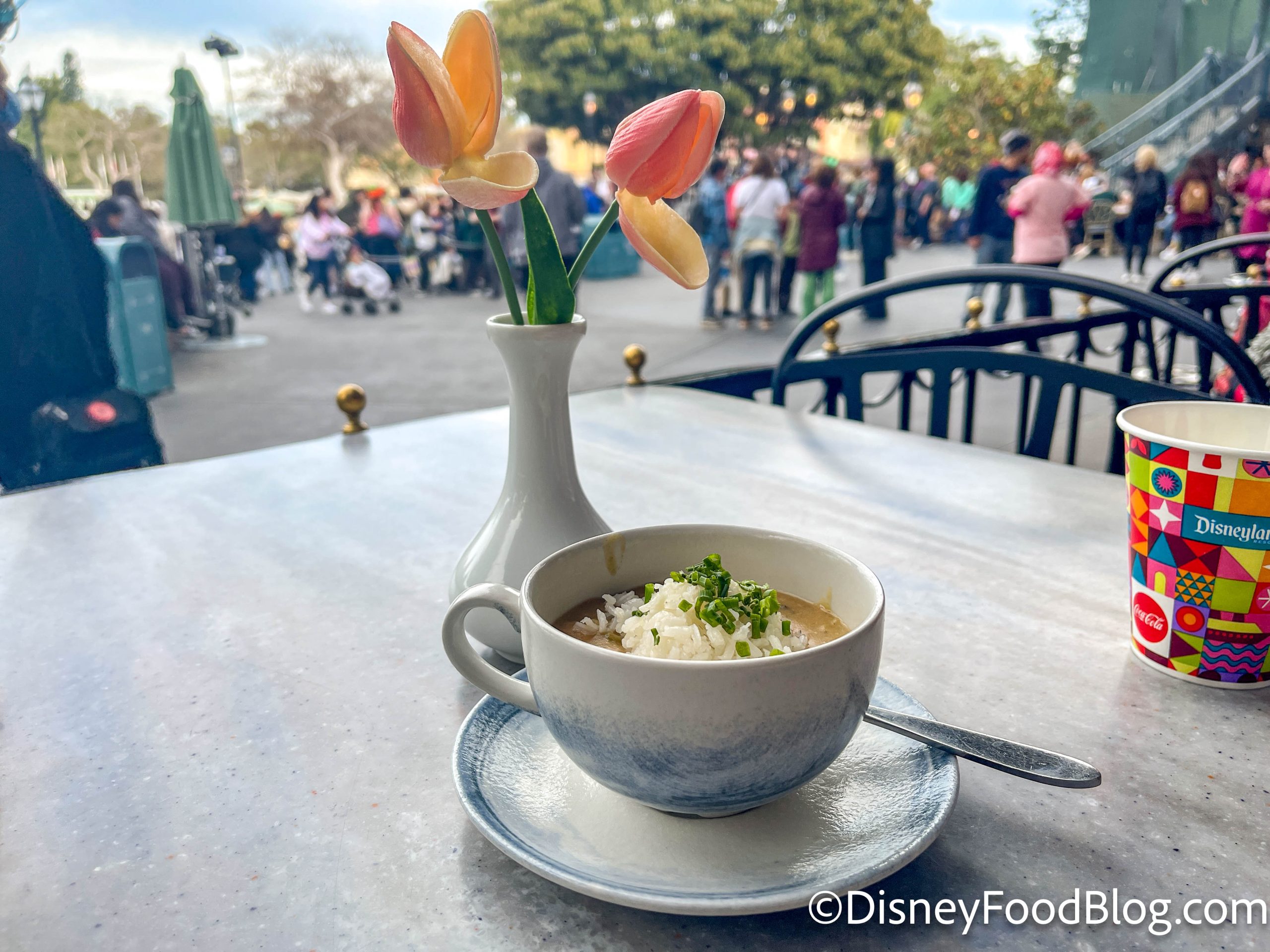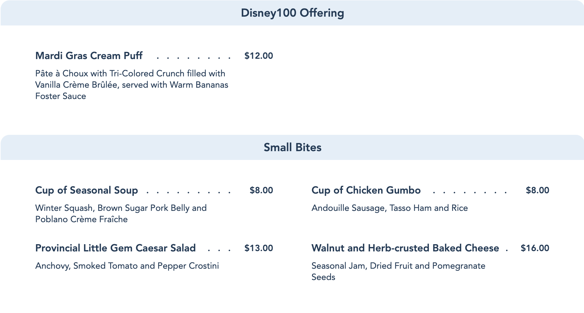 As you might expect, the menu is filled with New Orleans-inspired eats, including some Cajun flavors. For a limited time, you can order the Mardi Gras Cream Puff as part of the Disney100 celebrations. But if you want something that’s more of a staple, try out the seasonal soup or Chicken Gumbo to start your meal.