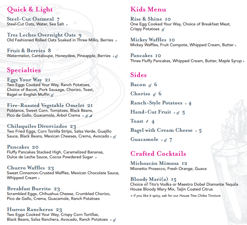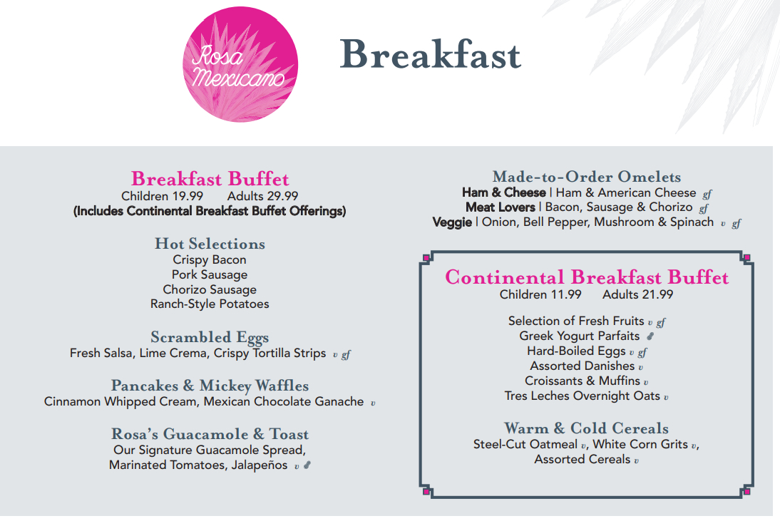 The restaurant serves breakfast, lunch, and dinner. The breakfast menu features a breakfast buffet for $29.99 for adults and $19.99 for children. The buffet will include hot selections like various meats, scrambled eggs, pancakes, Mickey waffles, made-to-order omelets, and Rosa’s Guacamole and Toast. A Continental Breakfast Buffet will also be available for $21.99 for adults and $11.99 for children.