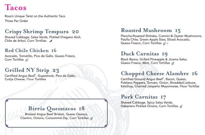 Lunch entrees include Tacos, Fresh Ahi Tuna, Red Chile Chicken, Birria Quesatacos, Duck Carnitas, and more. For Sandwiches, a Torta and Cheeseburger Grande will be available. Guests will also be able to order sides, like Sweet Corn Esquites and Mac n Queso.