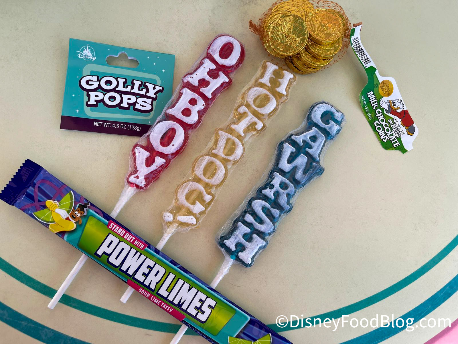These lollipops feature classic phrases — “Gawrsh“(from Goofy), “Hot Dog!” (from Mickey Mouse’s Clubhouse), and “Oh Boy” (from Mickey)!