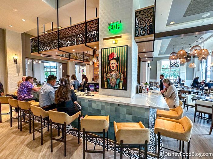 The restaurant as a whole is divided into a few different sections including the bar and then other seating areas. None are particularly “better” than the others, but some are more focused on Frida Kahlo, while others have views of the outside/the water, and one section is right by the kitchen (so the hustle and bustle there might be a bit much for some — while others might find looking into the open-kitchen to be a highlight of the meal).