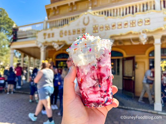 Over at The Golden Horseshoe, we found the Strawberry Sprinkle Sundae. This seasonal treat features Strawberry Ice Cream, Raspberry Drizzle, Rainbow Sprinkles, and Iced Cookies.