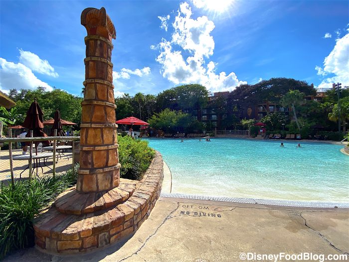 Do you want to soak in a zero-entry oasis surrounded by an African savanna? Animal Kingdom Lodge has two large pools that camouflage these concrete watering holes with beautiful landscaping. It boasts those unique savanna views and close proximity to some fun animal viewing areas (like flamingos). Plus, the Animal Kingdom Lodge pool is just steps away from Zebra Domes!