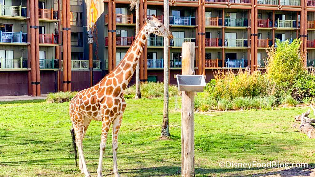 Jambo! And welcome to Animal Kingdom Lodge! This is more than your typical hotel, and honestly, it’s beyond the standard of a typical Disney hotel. Definitely, the only Disney resort where you can wake up and view some giraffes out your window, and drink coffee or snack on some Zebra Domes on your balcony while watching real-live zebras.