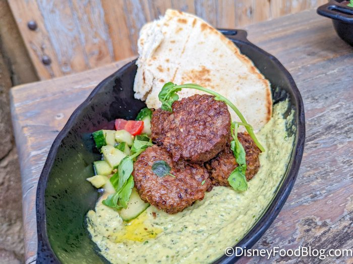 At lunch or dinner, look for the Felucian Kefta and Hummus Garden Spread made with Plant-based Meatballs, Herb Hummus, Tomato-Cucumber Relish, and Pita.