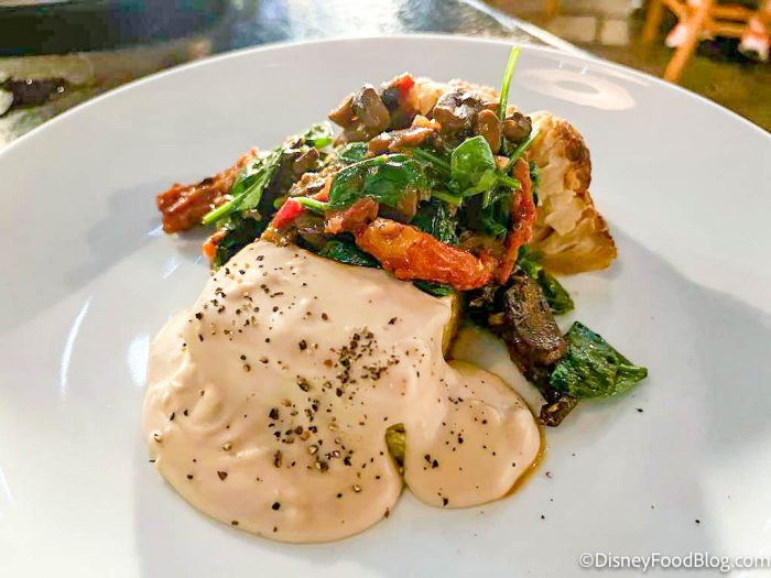 Next up, check out this entree! The Polenta Cake, Mushroom, and Herb Cauliflower features Polenta layered with Sautéed Mushroom, Spinach, and Red Pepper with a Cashew-Cheese Sauce. Our team member who tried it and is a plant-based eater was totally astounded by the dish, and even our reporter who doesn’t stick to a plant-based diet was really impressed (and might even consider ordering it over the other menu options they tried during their recent visit)!