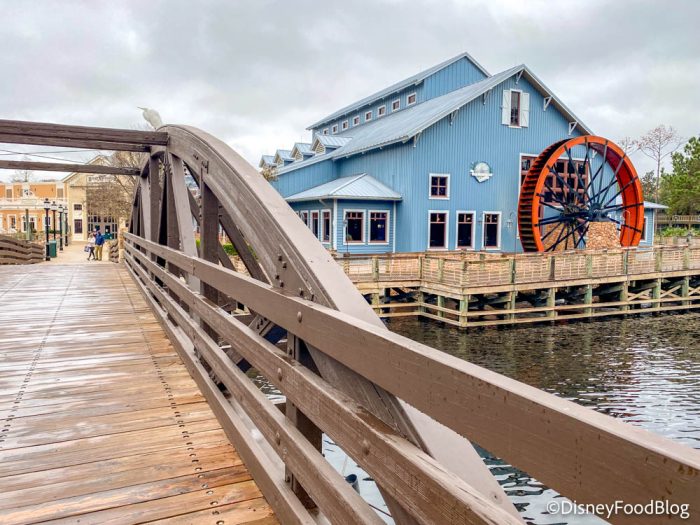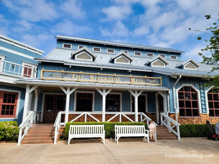 Riverside Mill Food Court features Counter Service classics along with a few Southern-inspired dishes, all with a view of a 32-foot water wheel through the window. The Riverside Mill has great curb appeal with its blue exterior and long front porch.