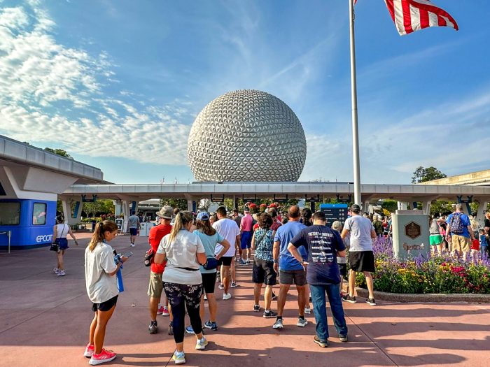 Over in EPCOT, the queue to enter the park first thing in the morning wasn’t very long. We’ve seen the line extend much further back.