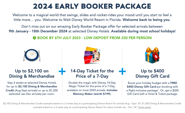 Disney has shared a new promotion for UK residents that rewards them for booking their next year’s holiday early. With the 2024 Early Booker Package, visitors who book by July 6th, 2023, are eligible for a dining and merch credit, discounted theme park tickets, and a Disney Gift Card.