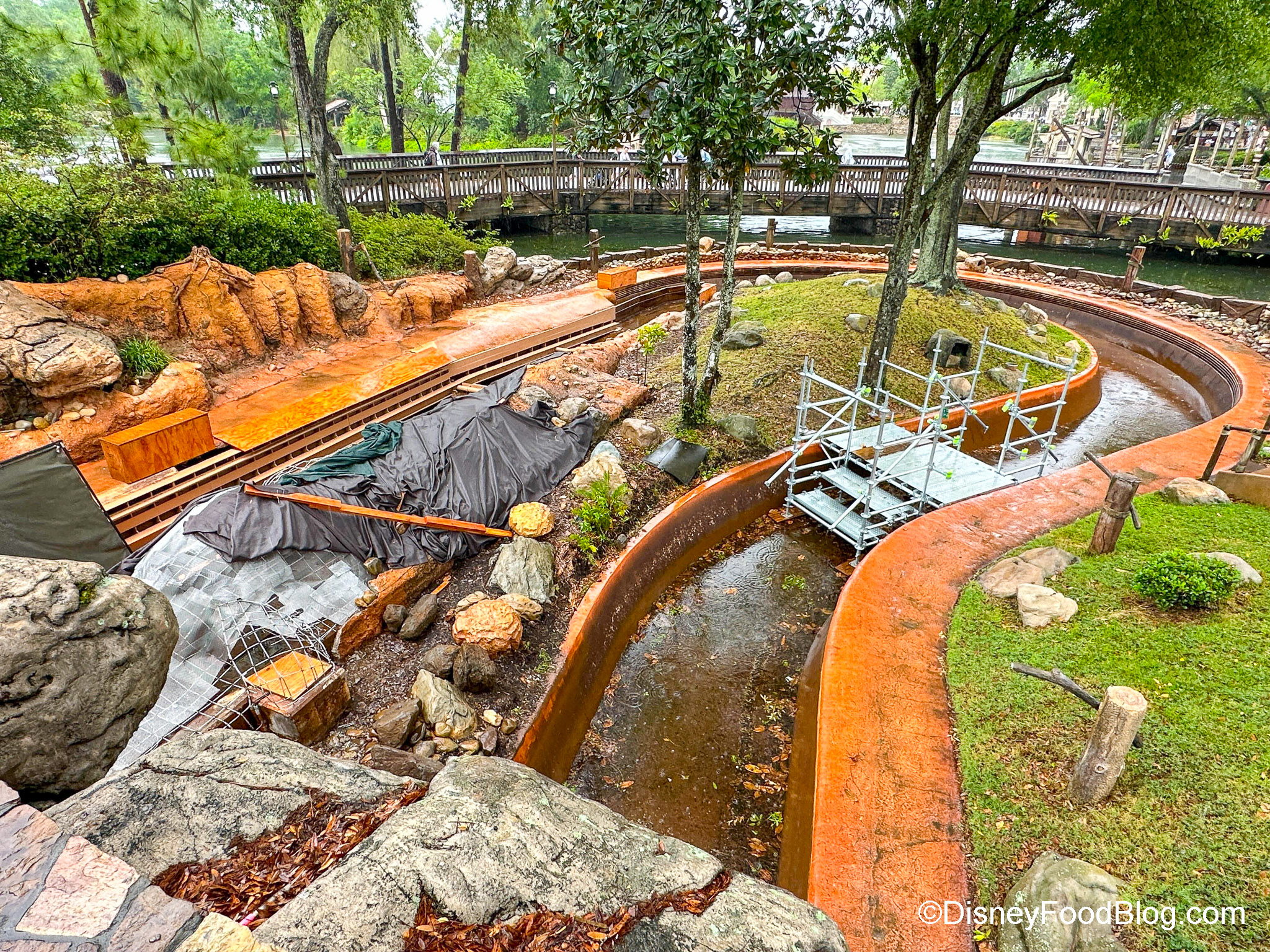 Also, it looks like some kind of wire frame is being built at the moat for more rocks where the ride splashes down.