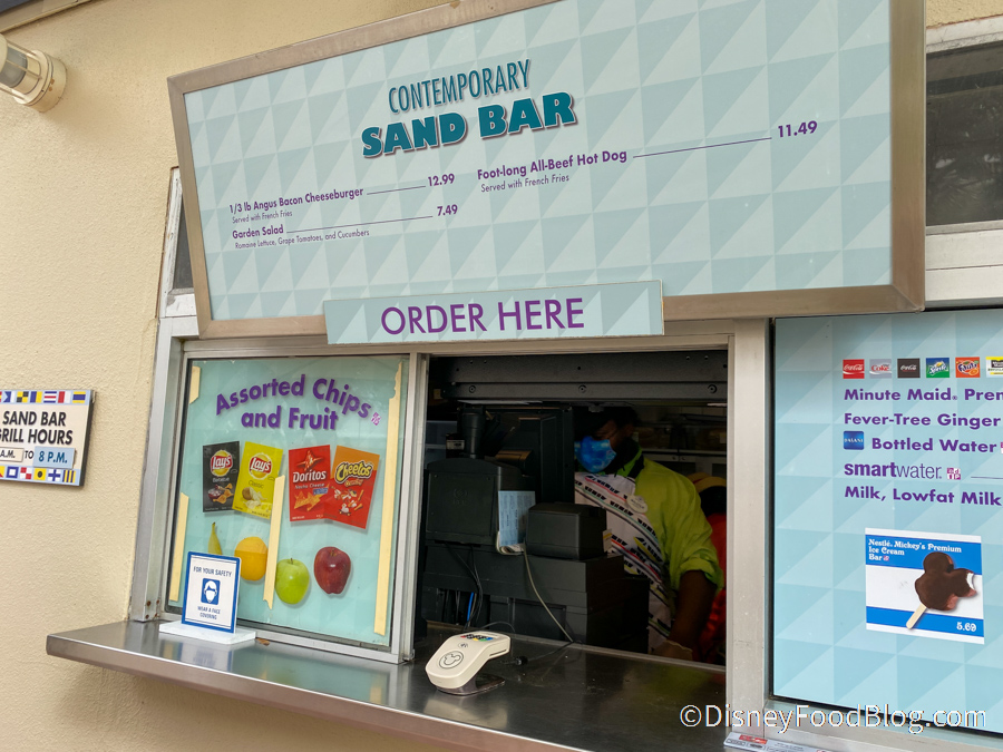 The Sand Bar is a modern poolside counter located in the Contemporary Resort’s marina and pool area. While the food menu is limited, there is a full bar menu along with classic beachy cocktails like Mai Tais and Banana Cabanas up for grabs. Or if you’re visiting the Bay Lake Pool, then the Cove Bar serves a selection of quick service meals (think wraps and salads), snacks, and cocktails.