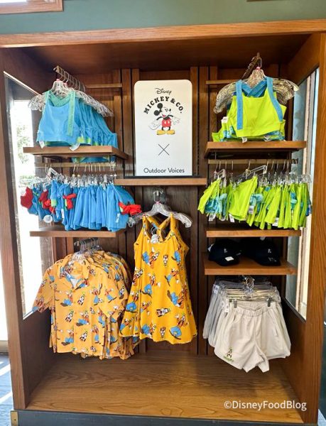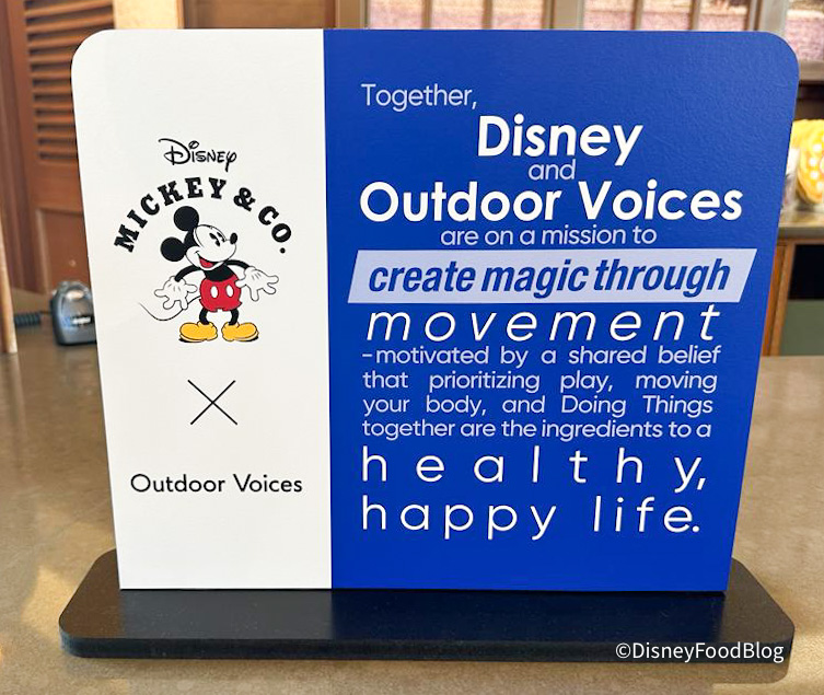 If you’re a fan of Outdoor Voices, or if you’re looking to give the brand a try during your next park trip, you’re in luck, because Outdoor Voices and Disney just dropped a collaborative collection together — and it’s available in the parks AND online. We first noticed the collection when we walked into Port of Entry at EPCOT and saw this sign, explaining the mission behind the collection. How cute is this?