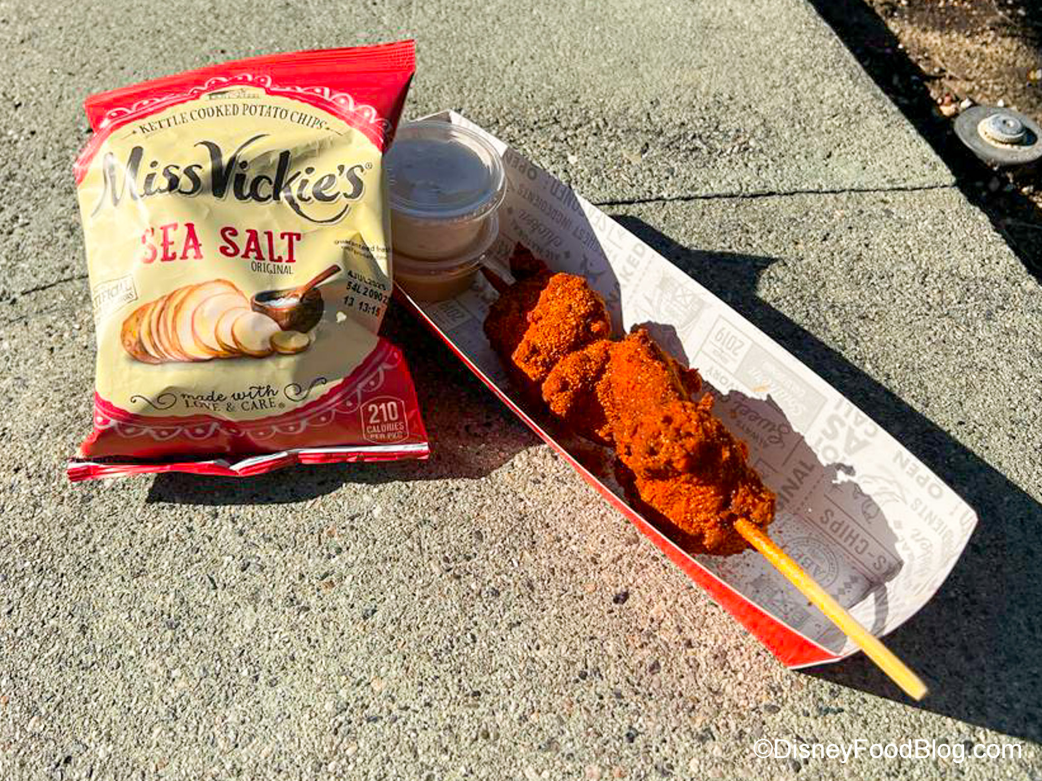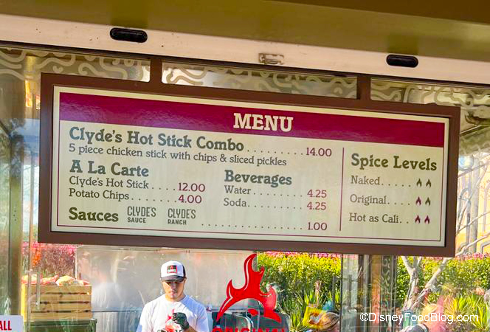 Clyde’s Hot Chicken is a cart in Downtown Disney that serves chicken strips (called “Clyde’s Hot Sticks”) with three different heat levels: Naked, Original, and Hot as Cali!