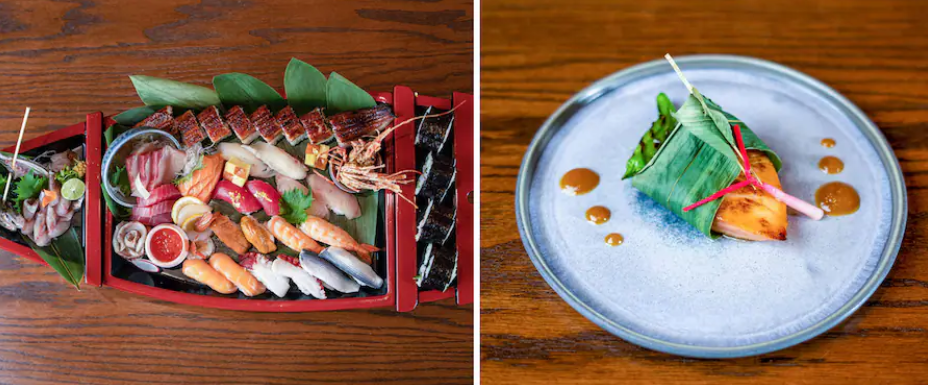 The Funamori features sashimi and sushi arranged on a boat-shaped platter.