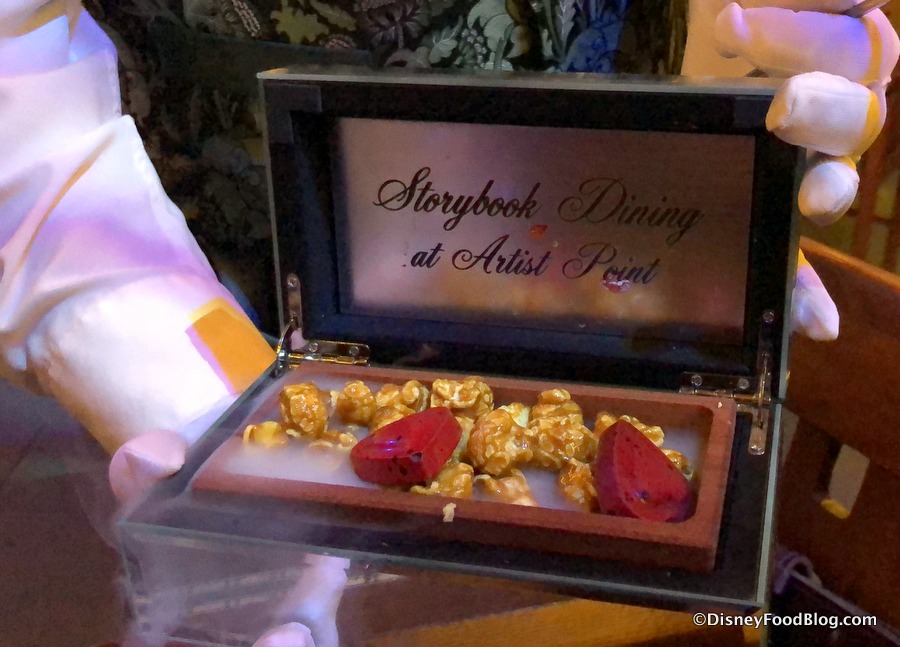While the food here doesn’t win any awards in book, it is VERY good for a character meal — that same write gives a special shout out to the gnocchi! Everything is presented beautifully from the tiered tree tower for your appetizers and desserts, to the entree plated and the incredible Huntsman’s Gift, which is presented in a box with dry ice to give it some seriously impressive panache.