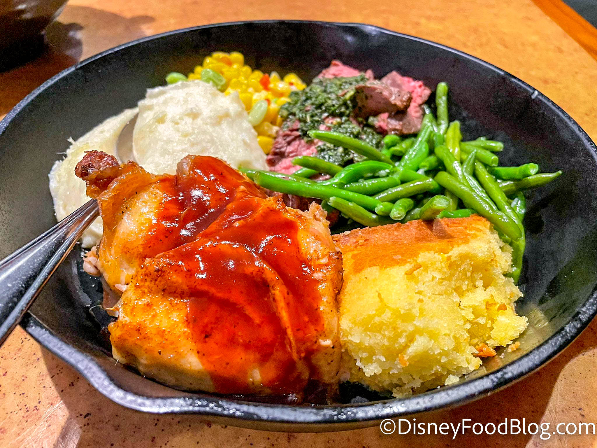 The Hoop Dee Doo Revue has been around nearly as long as Disney World — it held the title of the longest running stage show before the park closures in 2020. The menu features BBQ classics, like fried chicken, ribs, cornbread, and baked beans, and they come in served cast iron.
