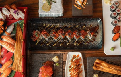 The Tokyo Negi Roll features green onion tempura rolled with tuna tataki and topped with jalapeno aïoli, shredded carrot, and sliced jalapeno. There is also a Monster Roll and the Funamori — a sushi boat with a presentation of sashimi and sushi.