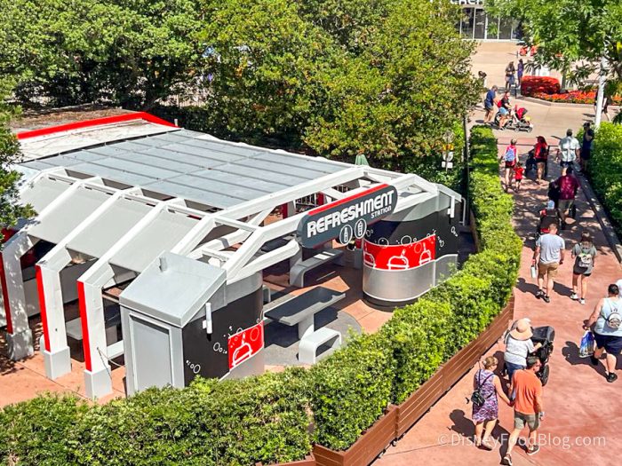This snack stand (previously called Cool Wash) in EPCOT is still under construction and hidden behind some hedges. We can see inside the station from the Monorail, however, and it looks like Disney has added some furniture inside the dining area.
