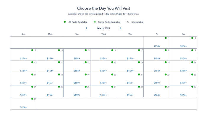 Again, remember this is just a decrease in the STARTING price per day. So, for example, August 28th, 2023 starts at $134+. Ticket prices break down to $134 for Animal Kingdom, $144 for Hollywood Studios, $134 for EPCOT, and $149 for Magic Kingdom.