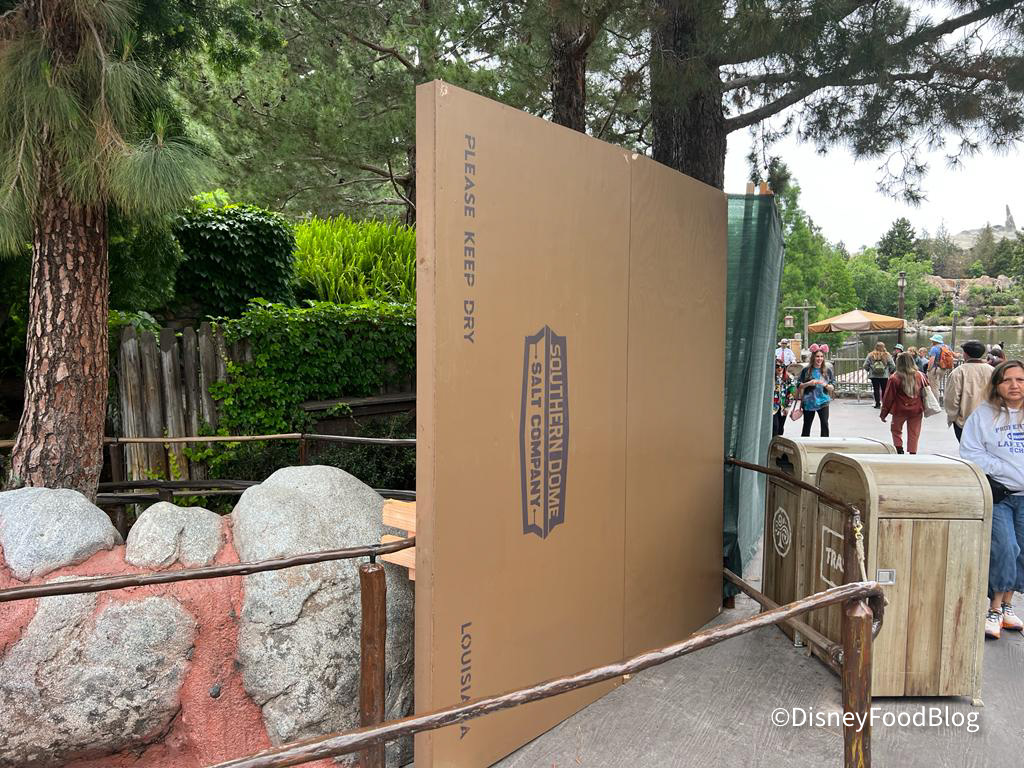 We even got to see a giant box just chilling out in the former ride queue. It says “Please Keep Dry” which is sort of hilarious since this used to be Splash Mountain, and the Southern Dome Salt Company label convinces us that the box is holding something for the new attraction!