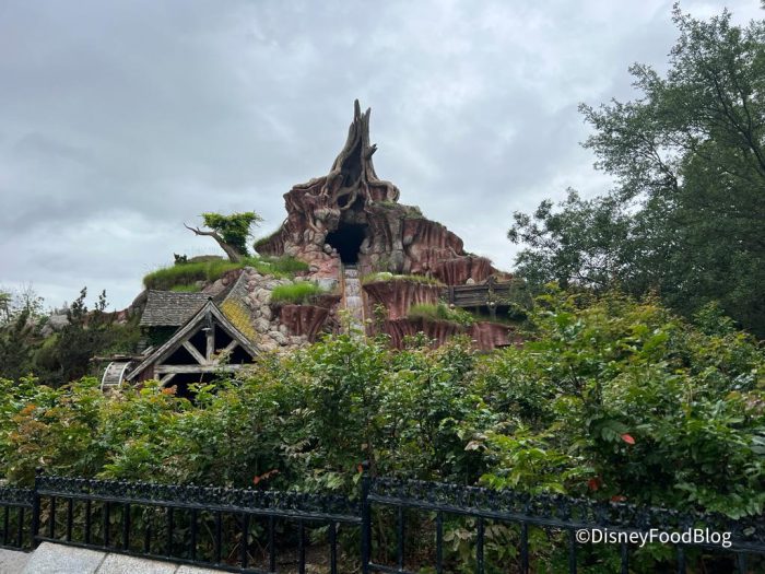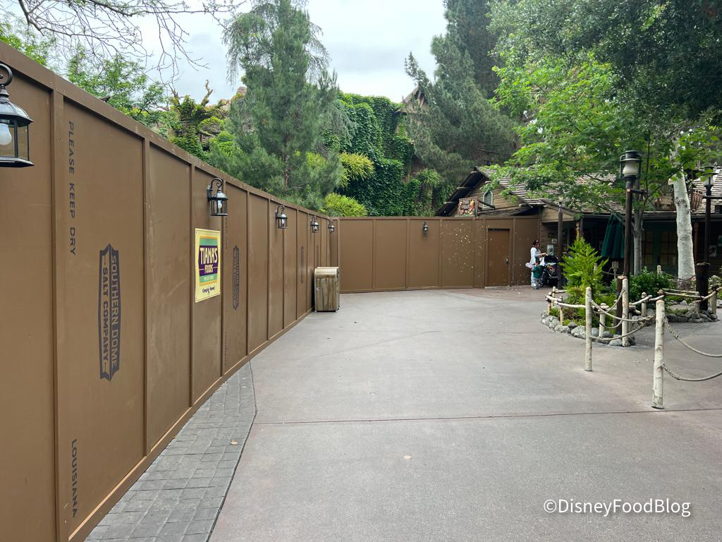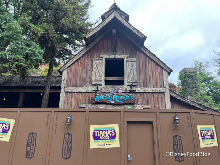 More walls have been put up surrounding the actual ride, though. The Splash Mountain sign is still up, but the walls in front say “Tiana’s Foods.” This juxtaposition cracked us up!