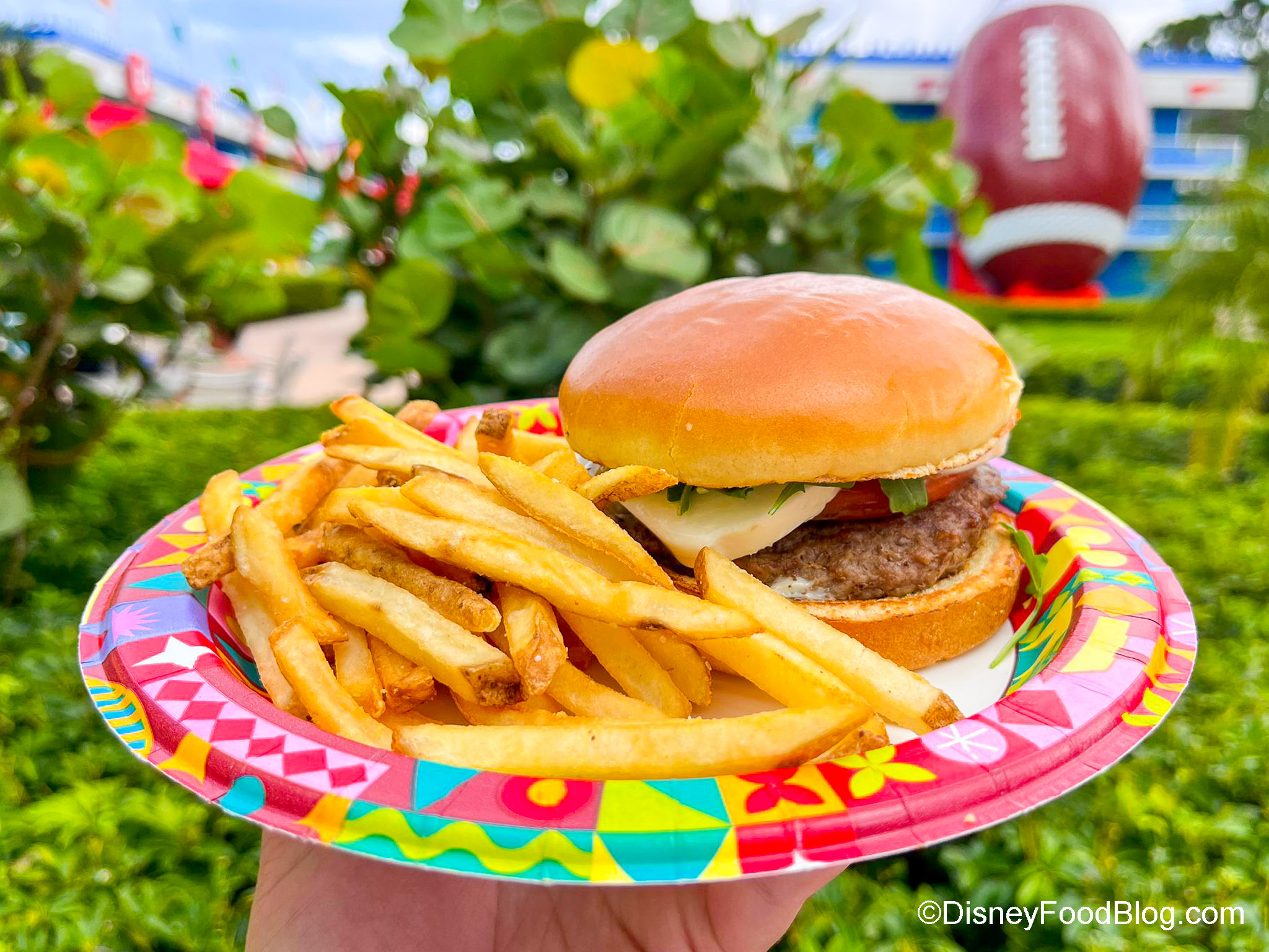 If you’re in Disney Springs, you might grab a burger from D-Luxe Burger (after all, that’s what they specialize in). Or maybe you like your burger in the form of Cheeseburger Pods at Disney’s Animal Kingdom. But what if you’re staying at Disney’s All-Star Sports Resort when that burger craving hits? Well, there’s an EXCLUSIVE burger there — and we’re trying it out for you.