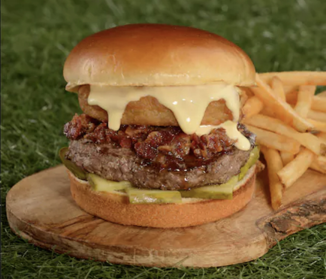 You can get a few burgers at End Zone Food Court, including a Bacon Cheddar Cheeseburger and a Cheddar Cheeseburger. But the SPECIAL burger here is the Bases Loaded Burger for $13.49, which is made with a Grilled Signature-blend Burger with Fresh Mozzarella, Basil Aioli, Arugula, and Tomato on a Toasted Brioche Bun served with French Fries.