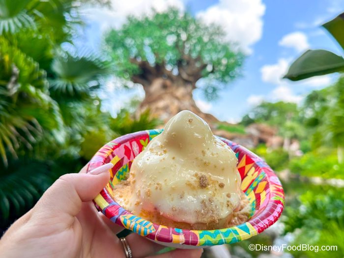 The problem is that the Dole Whip melts FAST. By the time we walked our Pineapple Crisp Cake with Dole Whip over to the Tree of Life, it was already starting to look a little blobby. It was almost liquid by the time we dived in to taste it. However, we will say that we don’t mind it being a little soupy because the flavors are just that good.