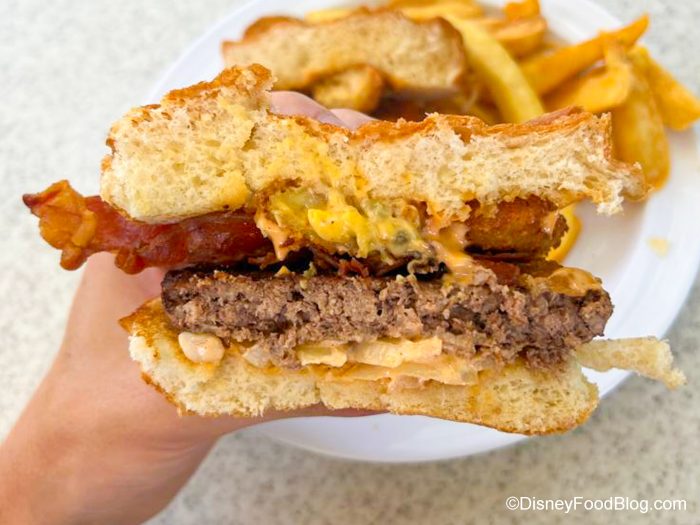 The pieces of bacon on the burger weren’t just thicked, but also packed with flavor — and cooked perfectly. No limp pieces of bacon here! It was crispy, but not TOO soft, but also not TOO crunchy (aka burnt). We will say the burger patty isn’t the best we’ve had from Disney — it was the standard bland burger you find at most counter service restaurants.