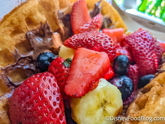 This snack is a BIG, fluffy waffle with strawberries, banana, blueberries, and the best part… chocolate-hazelnut spread. (In other words, Nutella.)