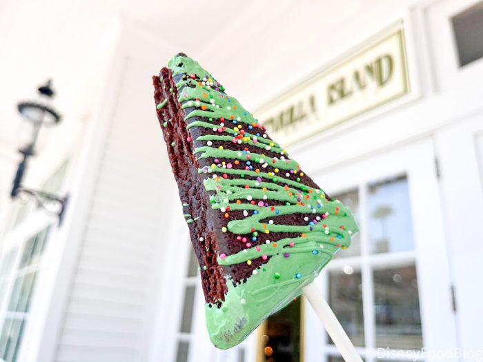 This cute treat is priced at $7.25 and is returning offering from the annual Grand Floridian Resort & Spa Gingerbread House. This one is made of a chocolate brownie that’s partially dipped in green-colored white chocolate and topped with a white chocolate drizzle and rainbow sprinkles. Here’s a quick peek at the label from the backside of the wrapping.