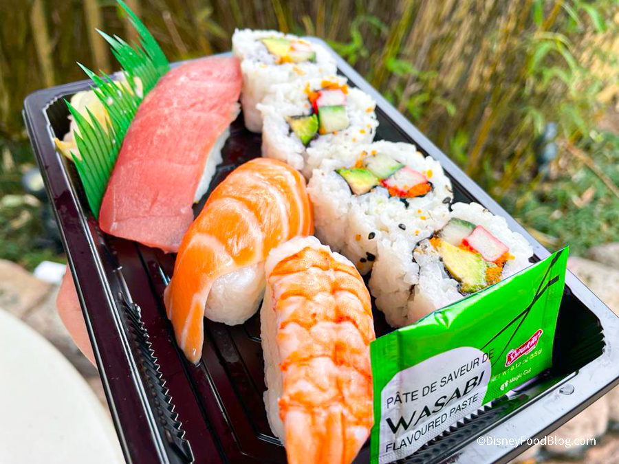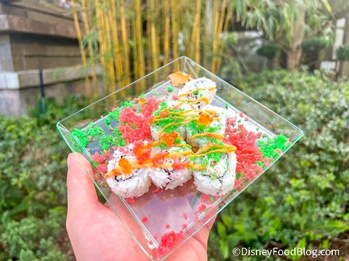 You may find pre-packaged sushi at Sunshine Seasons and grab-and-go sections in food courts and resort Quick Service locations. During the holiday season and at other EPCOT festivals, look for sushi at the marketplace booths.