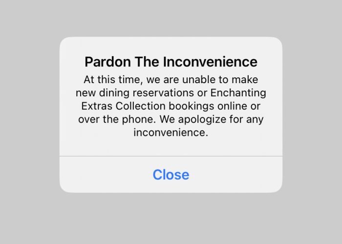 We got error messages online, and in the My Disney Experience app, a notification popped up that said, “Pardon the Inconvenience: At this time, we are unable to make new dining reservations or Enchanting Extras Collection bookings online or over the phone. We apologize for any inconvenience.”