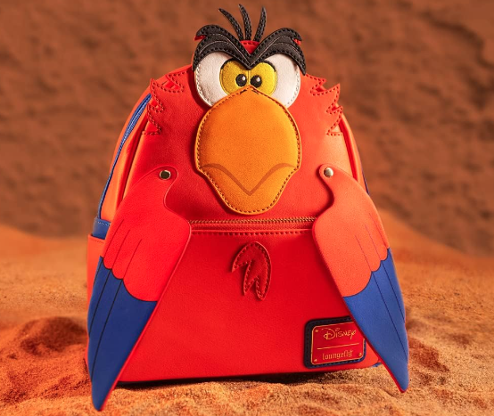 OK, this next one just might be our favorite — it’s a mini-backpack designed to look like the evil Iago from Aladdin! The front has his grumpy face with movable wings.